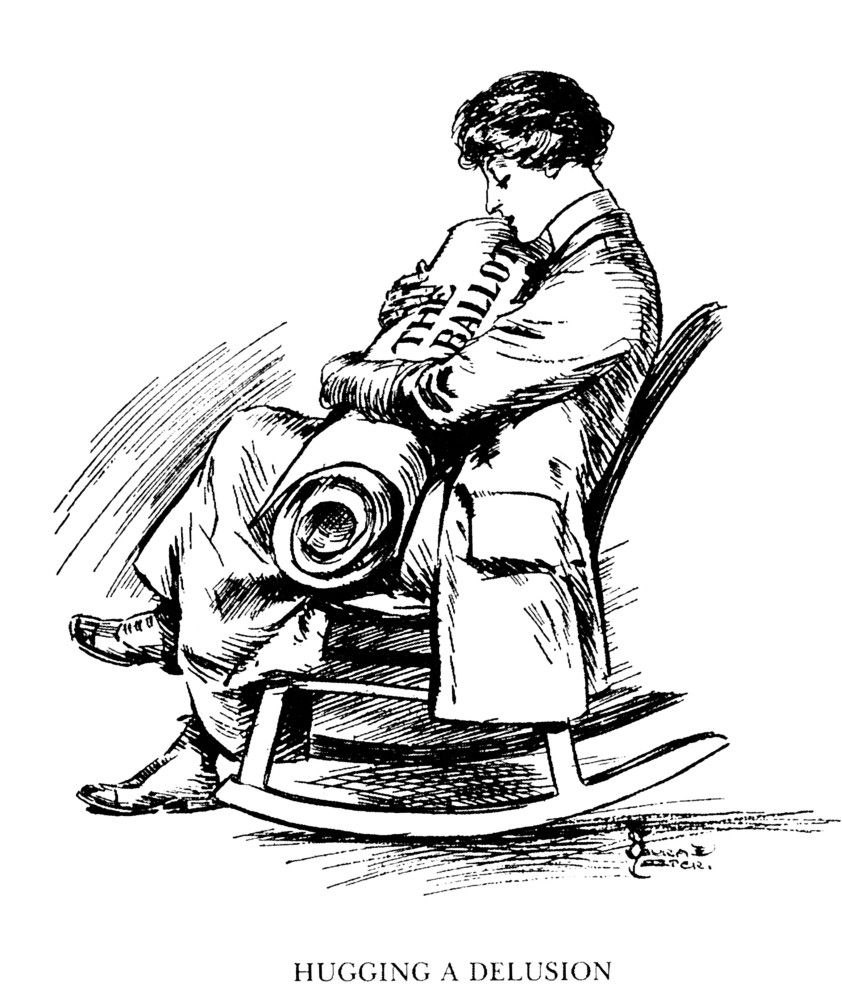 В работах Фостер суфражистки не выглядят «злыми» или «опасными». Чаще это женщины, которые просто ошиблись, сбились с пути, и, разумеется, уже жалеют о своём выборе. В Looking Backward («Оглядываясь назад», 1912) героиня поднимается к «славе», но с сожалением оглядывается на дом, детей и утраченную «нормальную» жизнь. В Hugging a Delusion («Обнимая иллюзию», 1915) женщина укачивает избирательный бюллетень как младенца, прижимая его к себе с той же заботой и нежностью. Право голоса здесь изображено как иллюзия и эмоциональная подмена — не политическое требование, а фантазия, в которую вложены чувства, предназначенные для «настоящей» женской роли. Суфражизм таким образом превращается не в борьбу с неравенством, а в ошибочную привязанность и самообман.
