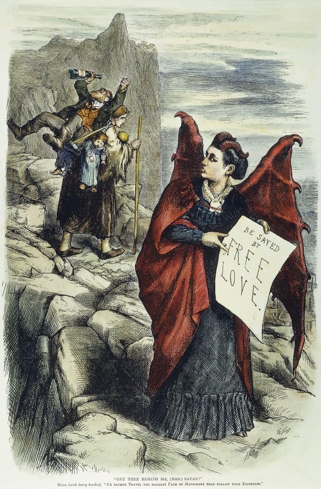 Карикатура «Убирайся от меня, миссис Сатана», 1872 год. Мелкий текст под изображением: «Жена (с тяжёлой ношей): „Я лучше пройду по самому трудному пути супружества, чем последую твоим стопам…“»